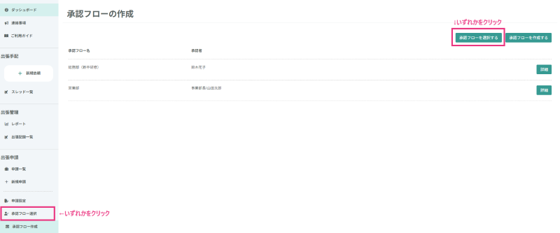 (1)画面左のメニューバー「承認フローの選択」もしくは承認フローの作成ページ内の「承認フローを選択する」をクリック