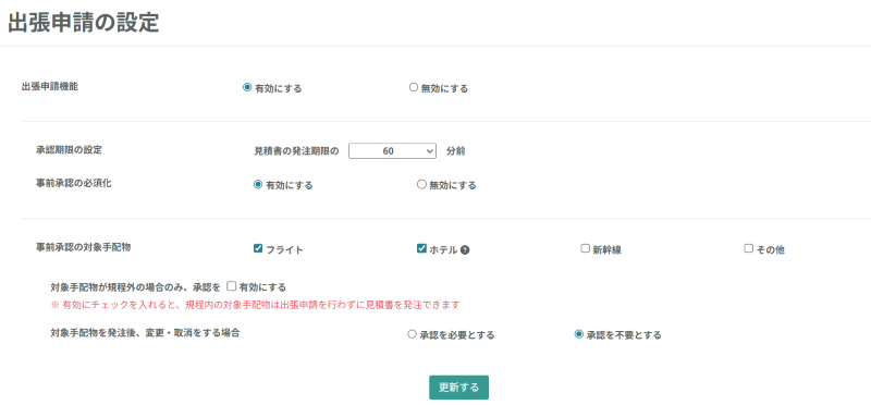出張申請機能を利用するか否かの設定です。無効にすると、画面左のメニューバーから出張申請機能の反映が削除されます。 |