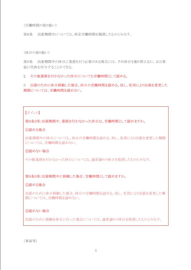 論点となる事項は赤字で記載したうえで、それに関連するポイントを条文の下に記載しています。ポイントを検討したうえで、条文の赤字部分を修正ください。